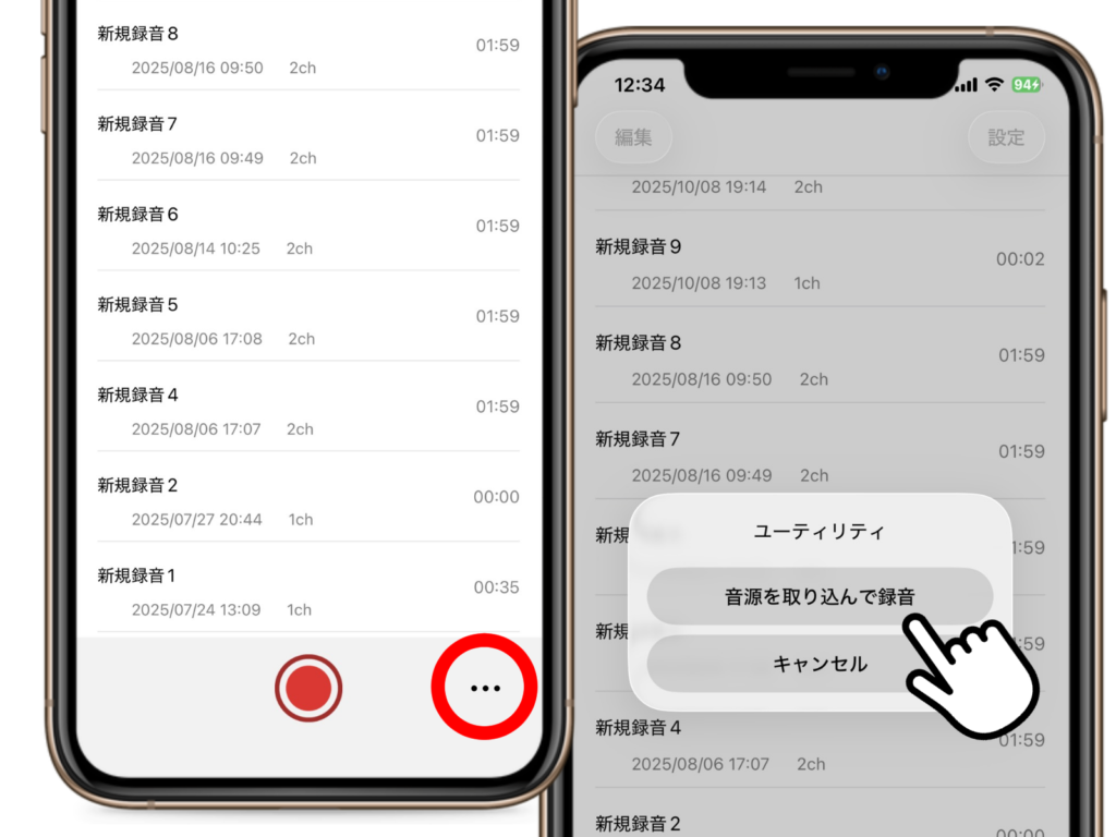 ホーム画面右下の三点リーダ「…」をタップし、「音源を取り込んで録音」を選びます。