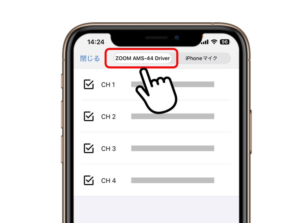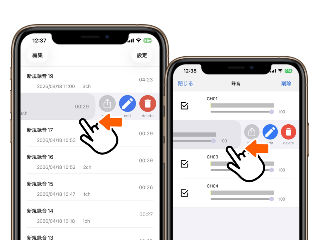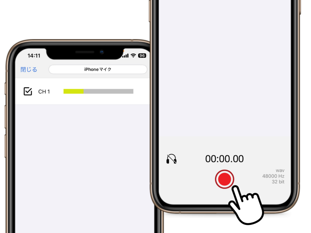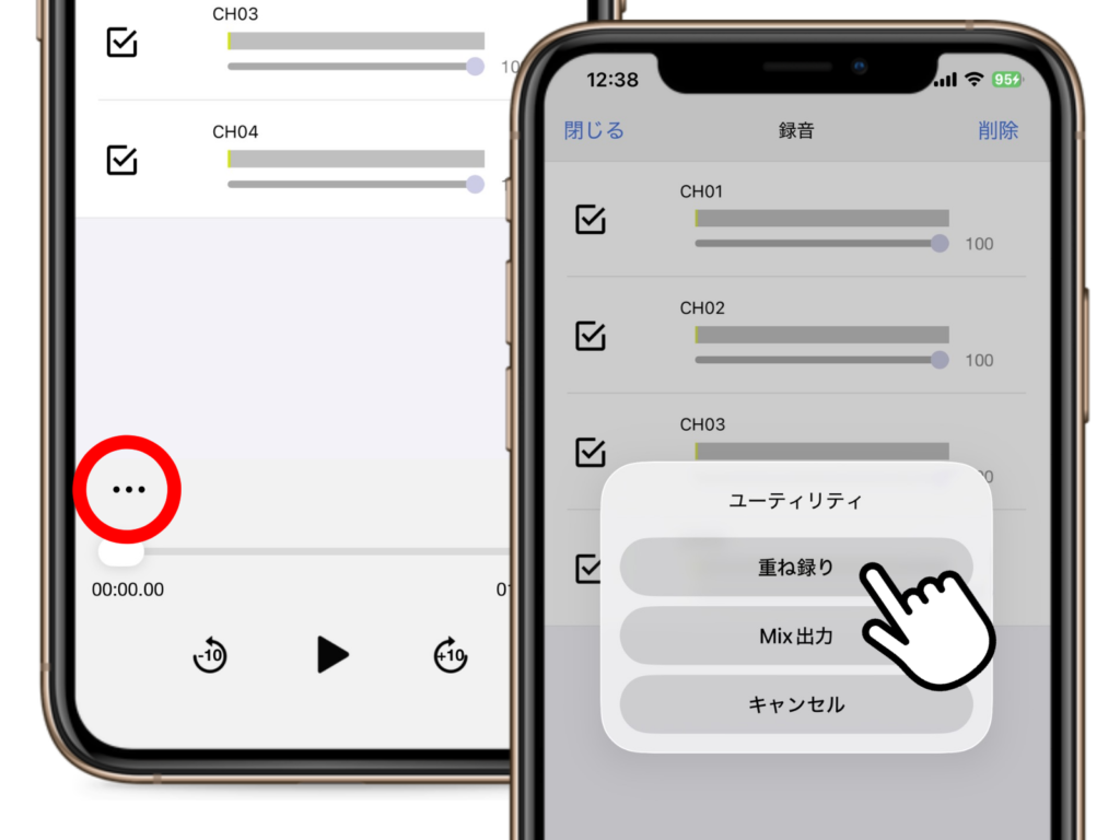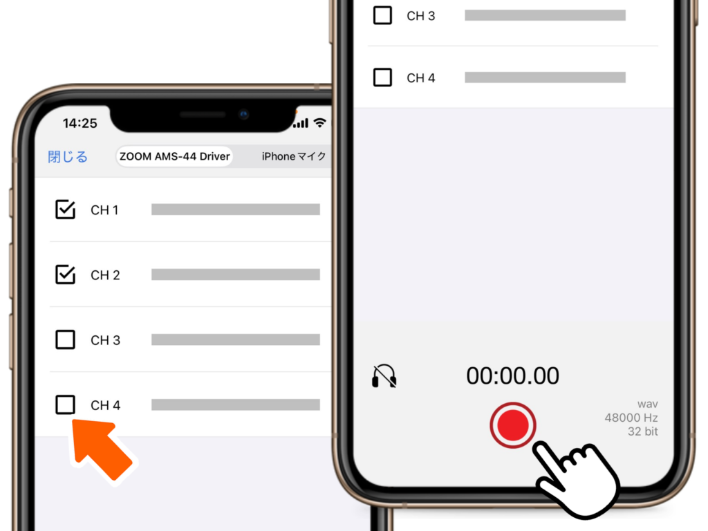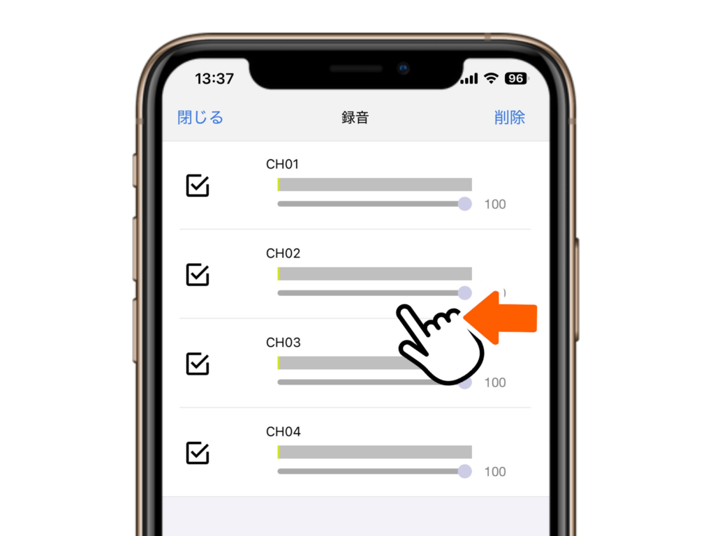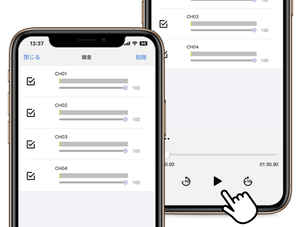 録音したチャンネルにチェックを入れた状態で録音ボタンをタップしてください。これでマルチチャンネルの録音が行えます