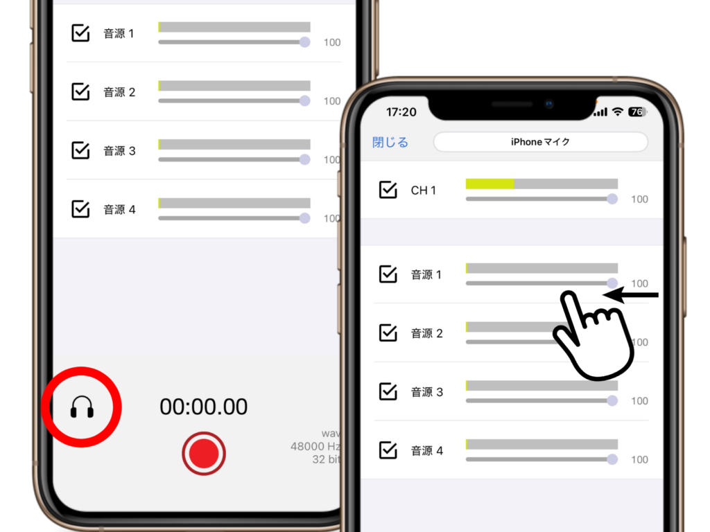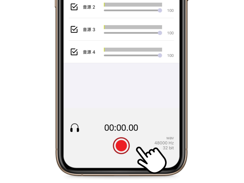左下のヘッドホンアイコンをタップすることで、イヤホンから音を聞きながら録音ができます。