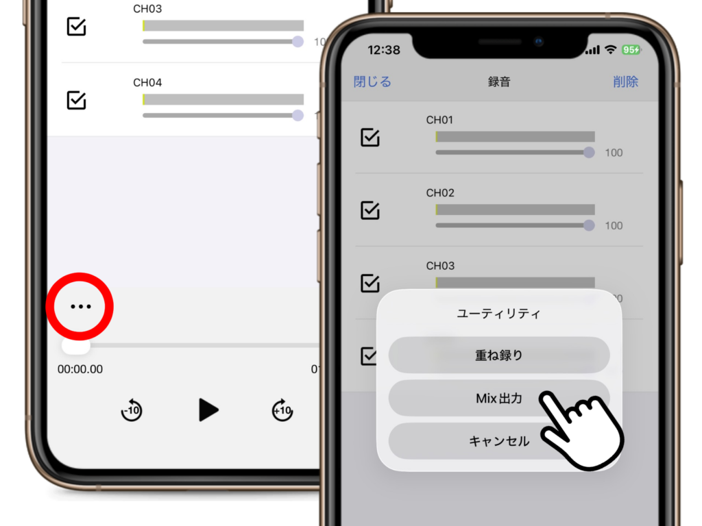 再生画面を開き、左下の三点リーダ「…」をタップし、「Mix出力」を選びます。
